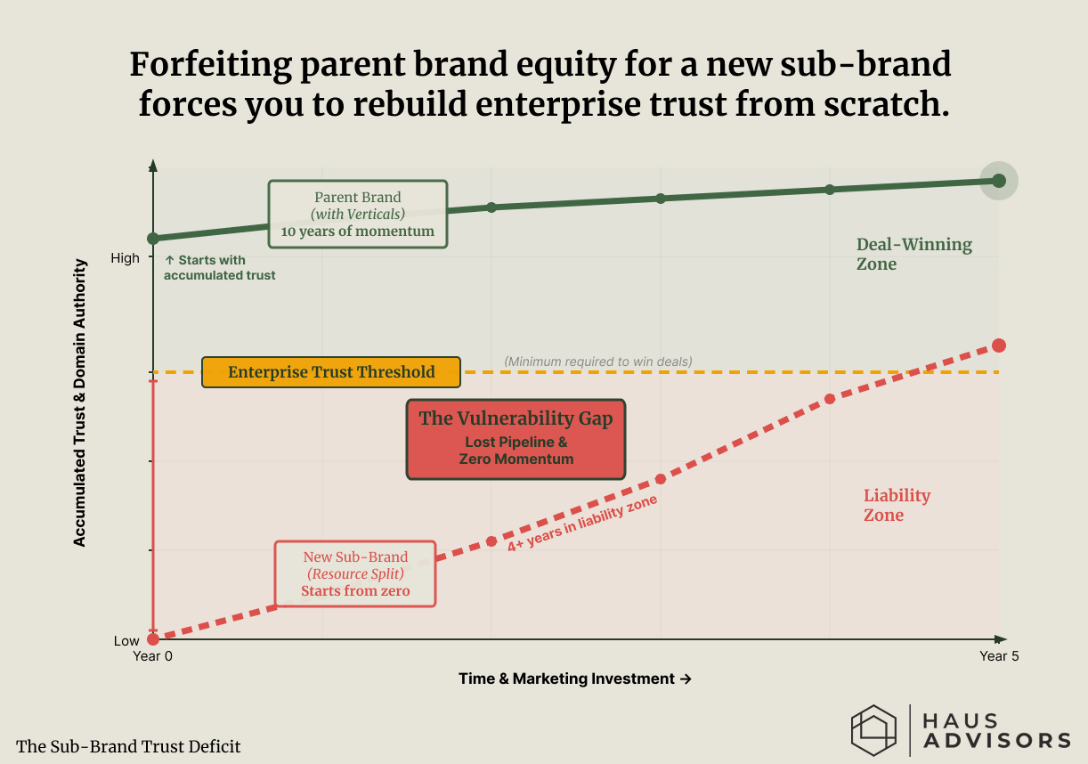 The Trust Deficit: While a parent brand maintains the momentum required to close enterprise deals, launching a sub-brand forces you into a vulnerability gap where you must rebuild domain authority from scratch.