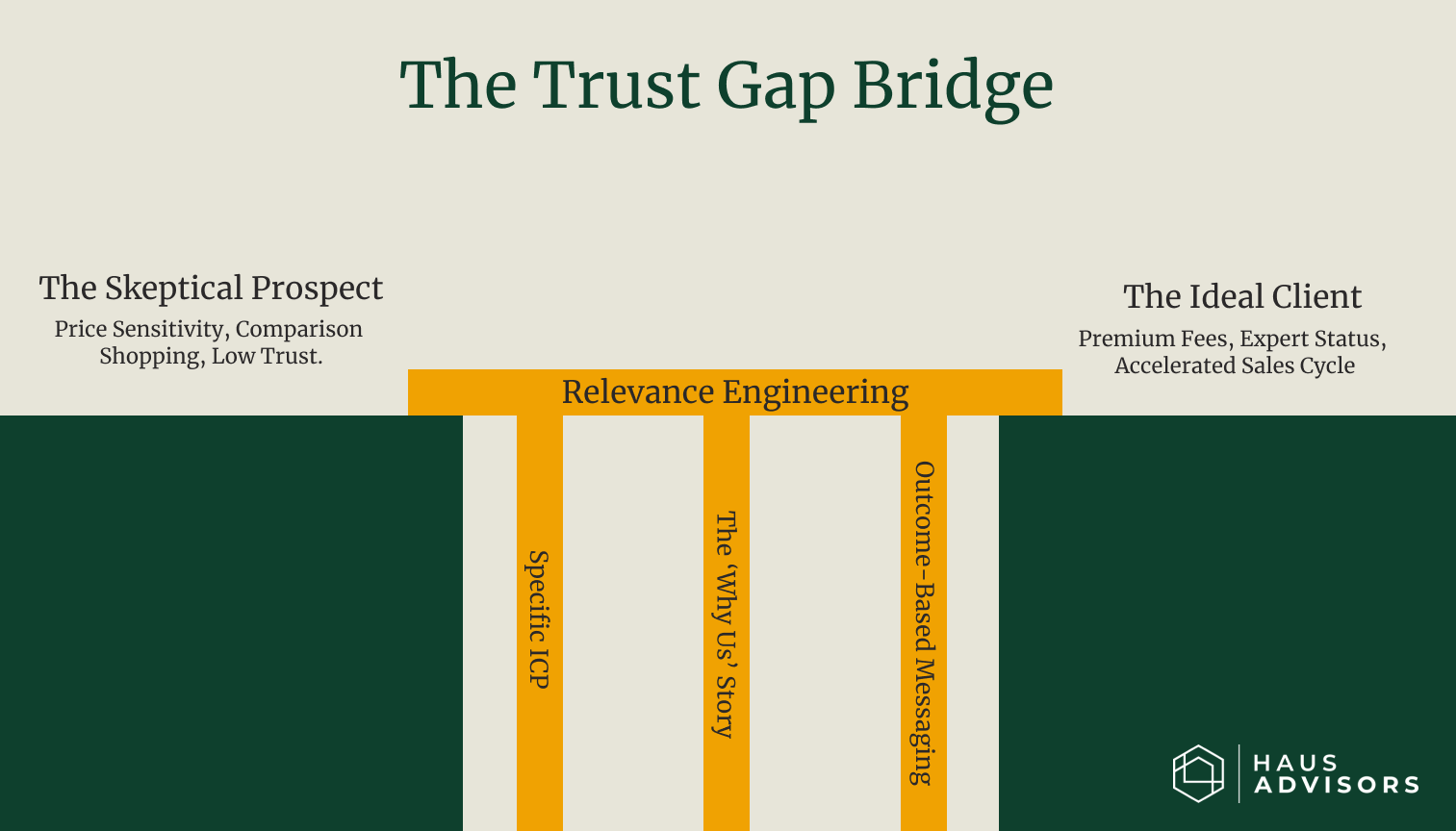 You have to address the Trust Gap before you spend a dollar on outreach. At Haus Advisors, we call that Relevance Engineering.