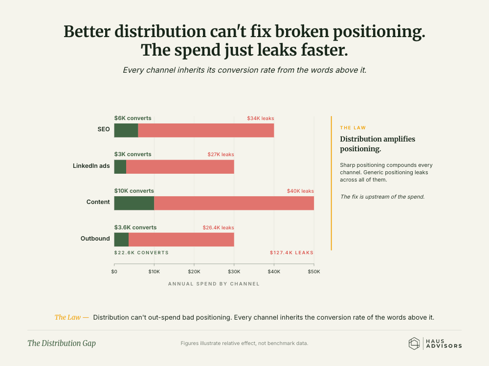 Most dev agencies waste $50K to $150K on marketing tactics that fail because the underlying positioning is broken. SEO. LinkedIn ads. Content production. None of it works. You can't fix a generalist message with better distribution.