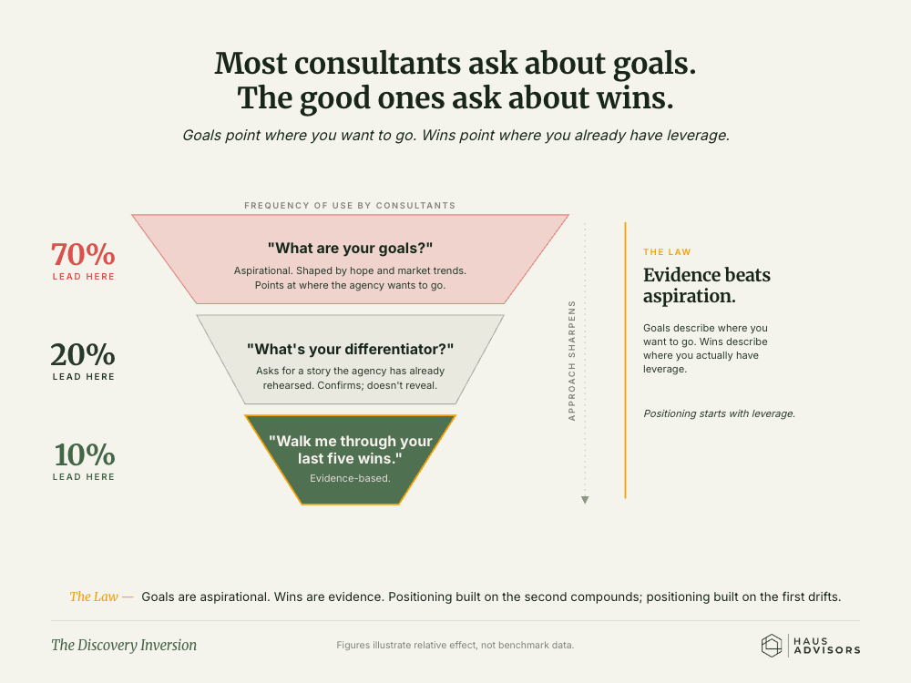 This tests whether they understand that real positioning requires exclusion. Not just "finding your unique angle." They should be prepared to have difficult conversations about trade-offs and help you navigate the short-term revenue risk of saying no to poor-fit opportunities.