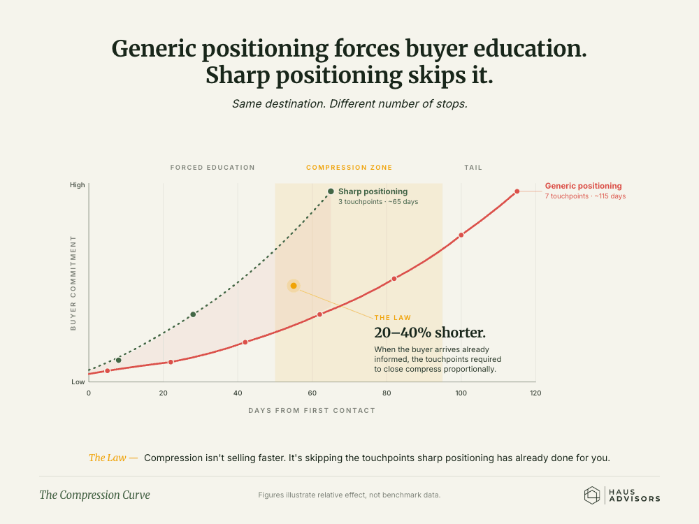 Haus Advisors works with technical agencies beyond $1M. Not SaaS. Not Fortune 500. Agencies. The structural rules are different. You can't differentiate on features. Your product is judgment. Your sales cycle depends on showing the prospect you've seen their exact problem before, not pitching a process.