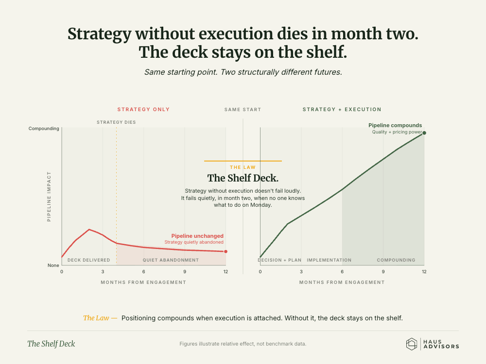 The positioning decision determines every downstream marketing investment. Your content strategy. Your outbound messaging. Your partnership targets. Your service packaging. All of it inherits from positioning. A consultant who gets this wrong doesn't just waste their fee. They waste 12 to 18 months of your team's execution effort.