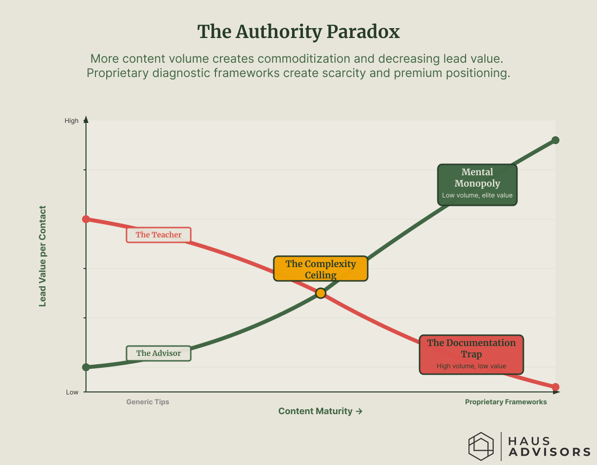 "High-volume, generic content follows the law of diminishing returns: the more you sound like a 'how-to' guide, the more you are treated like a commodity. This chart maps the necessary transition from 'Market Education' to 'Mental Monopoly', where your unique perspective becomes the only logical solution to a client’s problem."
