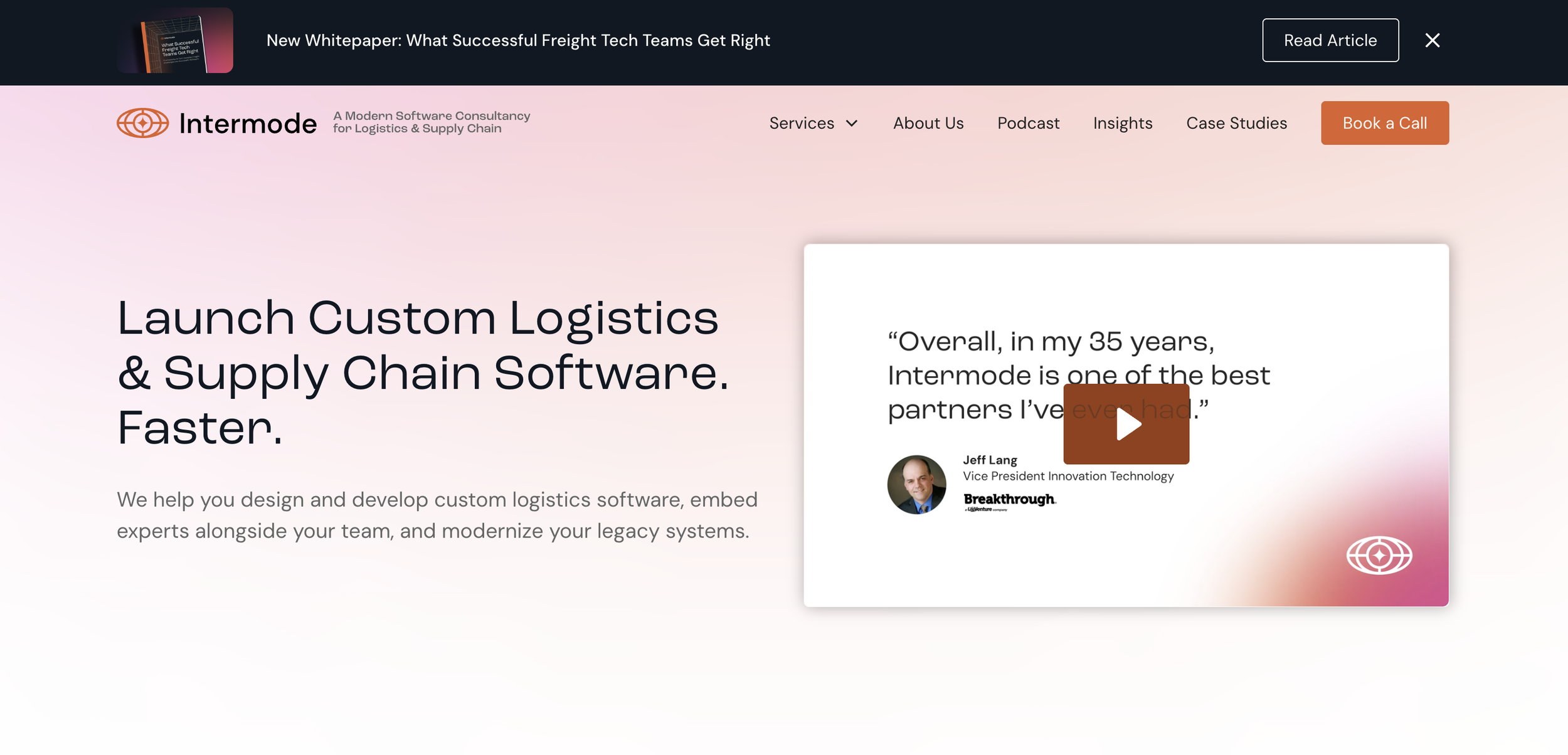 Intermode (Logistics). They lead with "Launch Custom Logistics & Supply Chain Software" and show interfaces specifically designed for freight tracking and carrier procurement. An operations director at a logistics company lands on this page and knows immediately: this agency has built the exact kind of system I need.