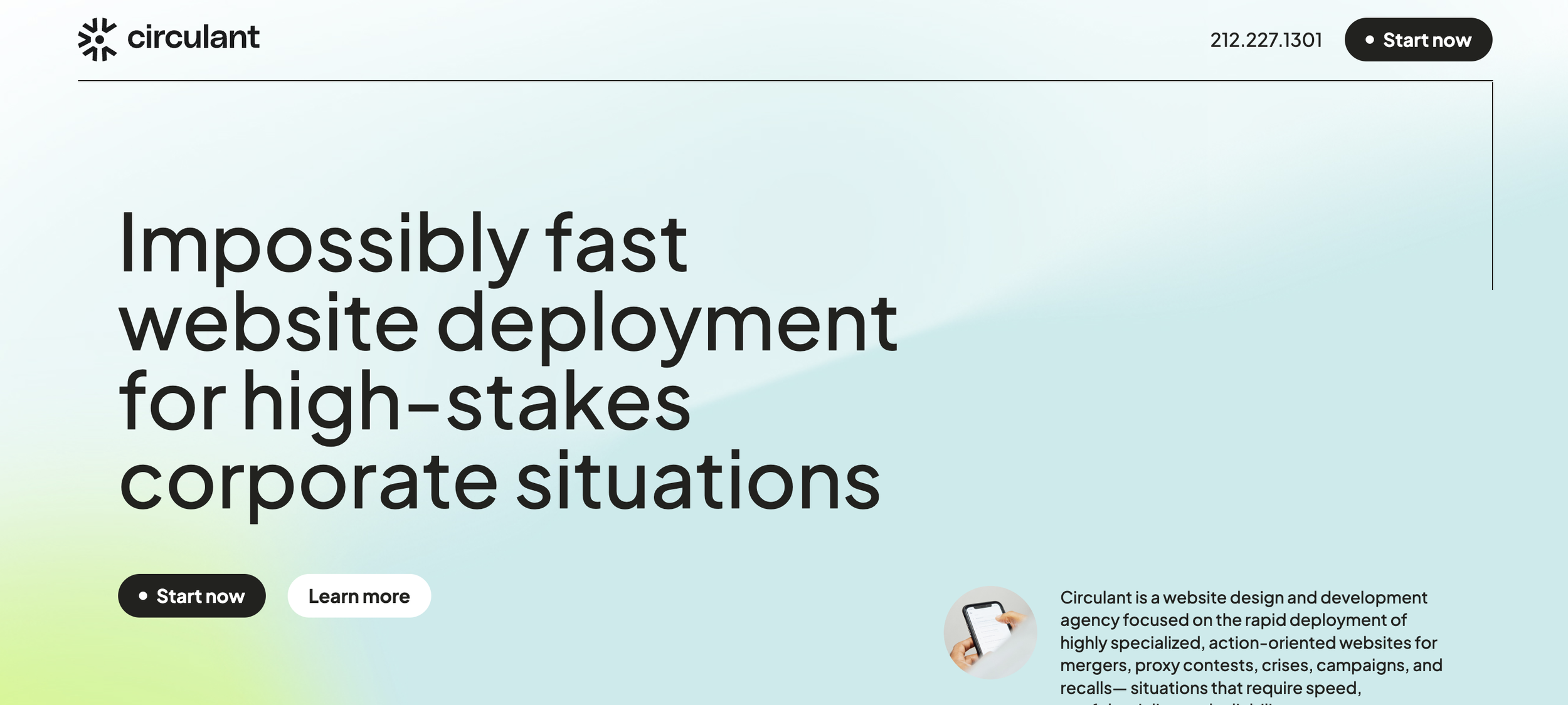Circulant (High-Stakes Corporate Situations). This is one of the most precise positioning statements on the web: "Impossibly fast website deployment for high-stakes corporate situations (Mergers, Proxy Contests, Recalls, Crises)." They disqualify 99% of web traffic to absolutely dominate the 1% who need a site launched in 72 hours for a $10B corporate merger. When the stakes are that high, the buyer isn't shopping for a discount. They're looking for certainty. Circulant's homepage provides that certainty in a single sentence.