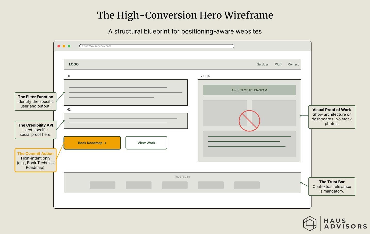 At Haus Advisors, we help dev shops and technical agencies eliminate positioning debt before they invest in a redesign. Our Why Us Sprint produces the positioning clarity, messaging hierarchy, and high-fidelity homepage wireframes that turn your website from expensive digital art into a pipeline generation system. If your homepage could belong to any dev shop, the positioning is the problem. Book a strategy call here →