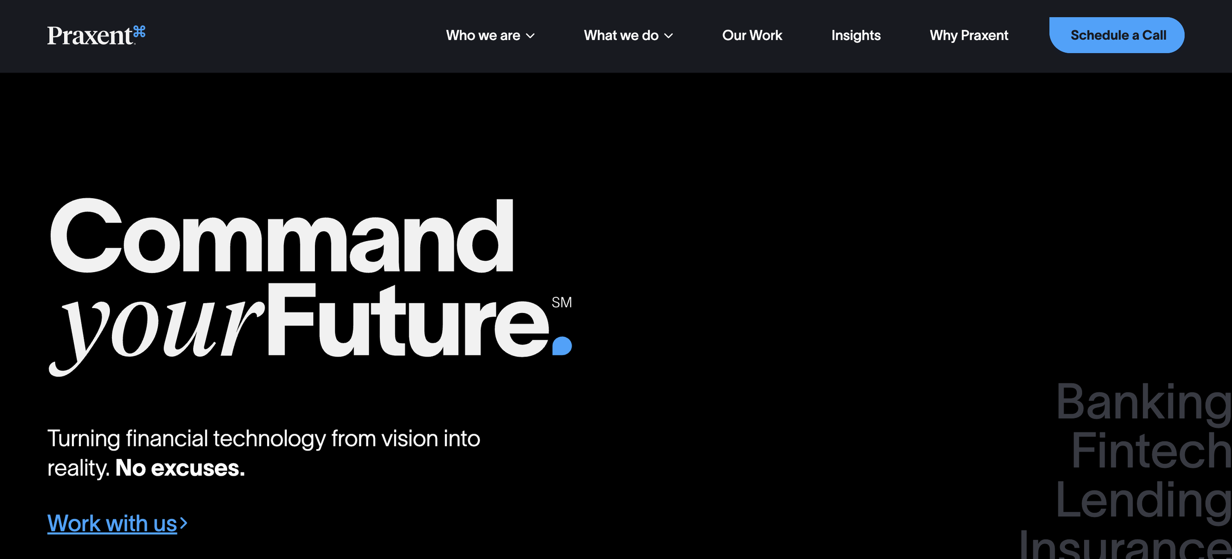 Praxent (Financial Services). They own the fintech integration space with language that speaks directly to wealth management and digital lending. The positioning simultaneously disqualifies buyers outside their vertical and looks like the only safe choice for those inside it.