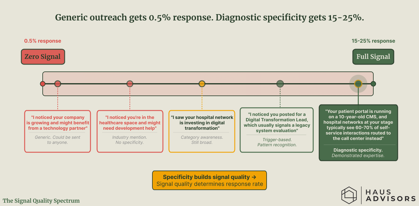 Precision outbound requires an asset to offer. The "diagnostic framework" or "case study" referenced in the emails has to exist. You can't offer a patient portal modernization readiness assessment if you haven't built one.