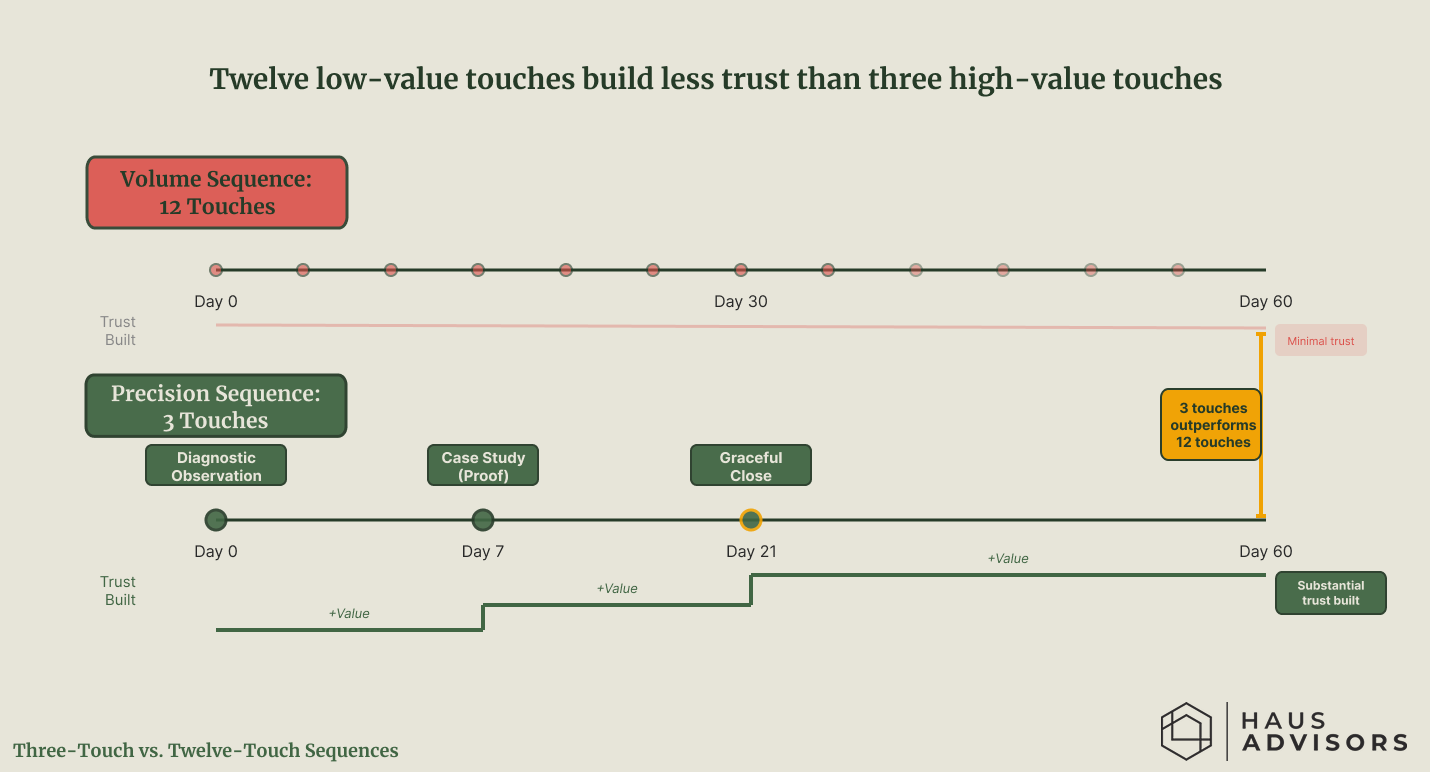 Twelve low-signal touches build less trust than three high-signal ones. More follow-ups don't fix an empty first message.