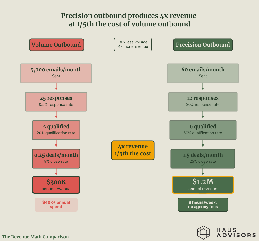Precision produces 4x the revenue at a fraction of the cost. It's slower to start (the first month is mostly list-building and research). But by month three, the pipeline is producing at a rate volume outbound never reaches, because every conversation starts at a higher level of trust and relevance.