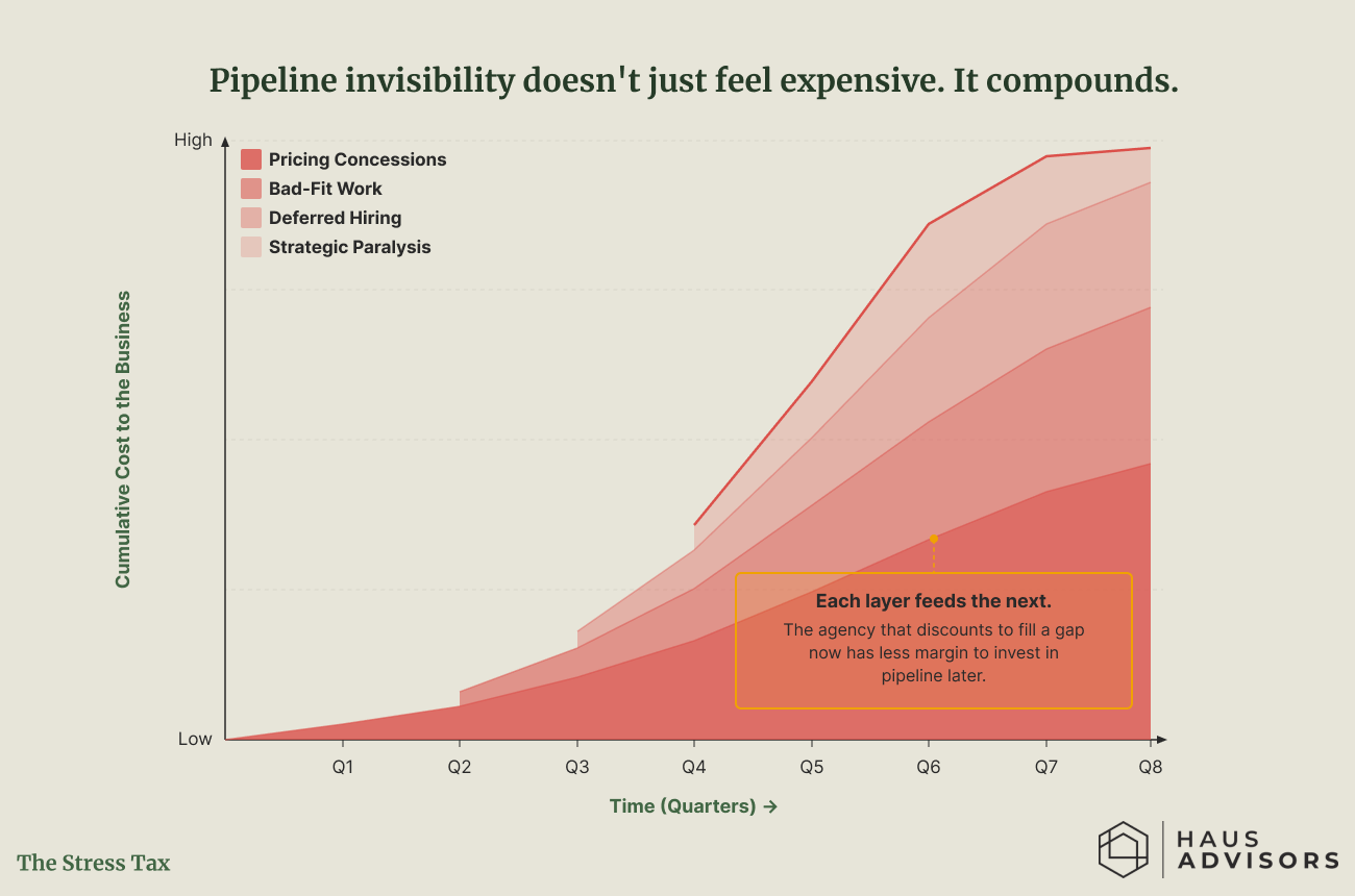 The Stress Tax: Pipeline invisibility creates four compounding costs: pricing concessions, bad-fit work, deferred hiring, and strategic paralysis. Each feeds the next. By Q5, the math is working against you.