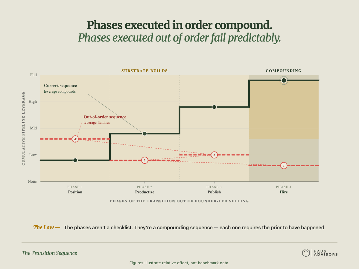 The actual path out of founder-led selling runs through four phases, in order. The order is not optional. Most transition failures are order failures.