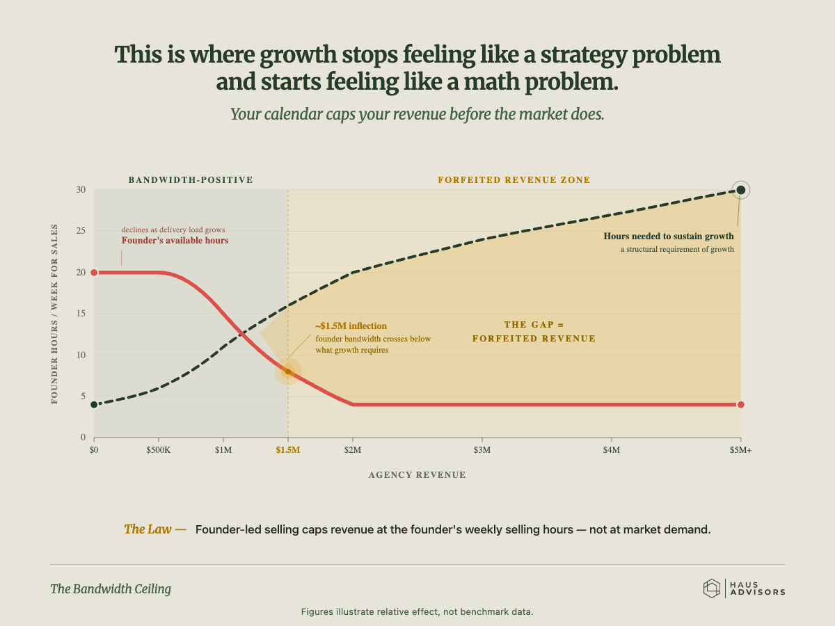 The Bandwidth Ceiling. Revenue gets hard-capped at the founder's weekly selling capacity. You can only have so many discovery calls, write so many proposals, close so many deals. Every hour of delivery is an hour not selling.