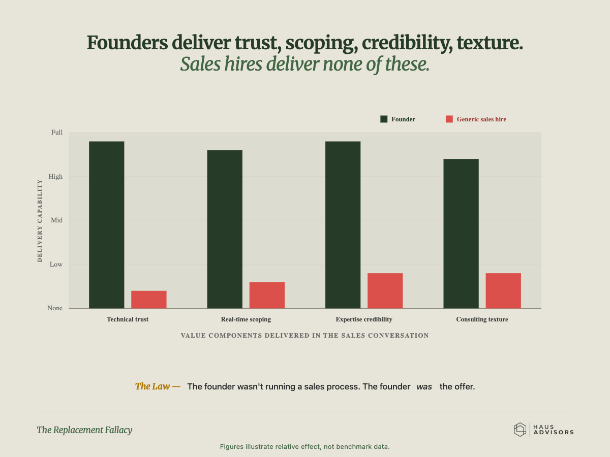 The Replacement Fallacy is the belief that a pipeline problem caused by founder-dependence can be solved by hiring someone to replace the founder in the sales function. It can't. The founder wasn't just doing sales activity. The founder was providing technical trust, custom scoping decisions, and credibility that the hire has no way to replicate.