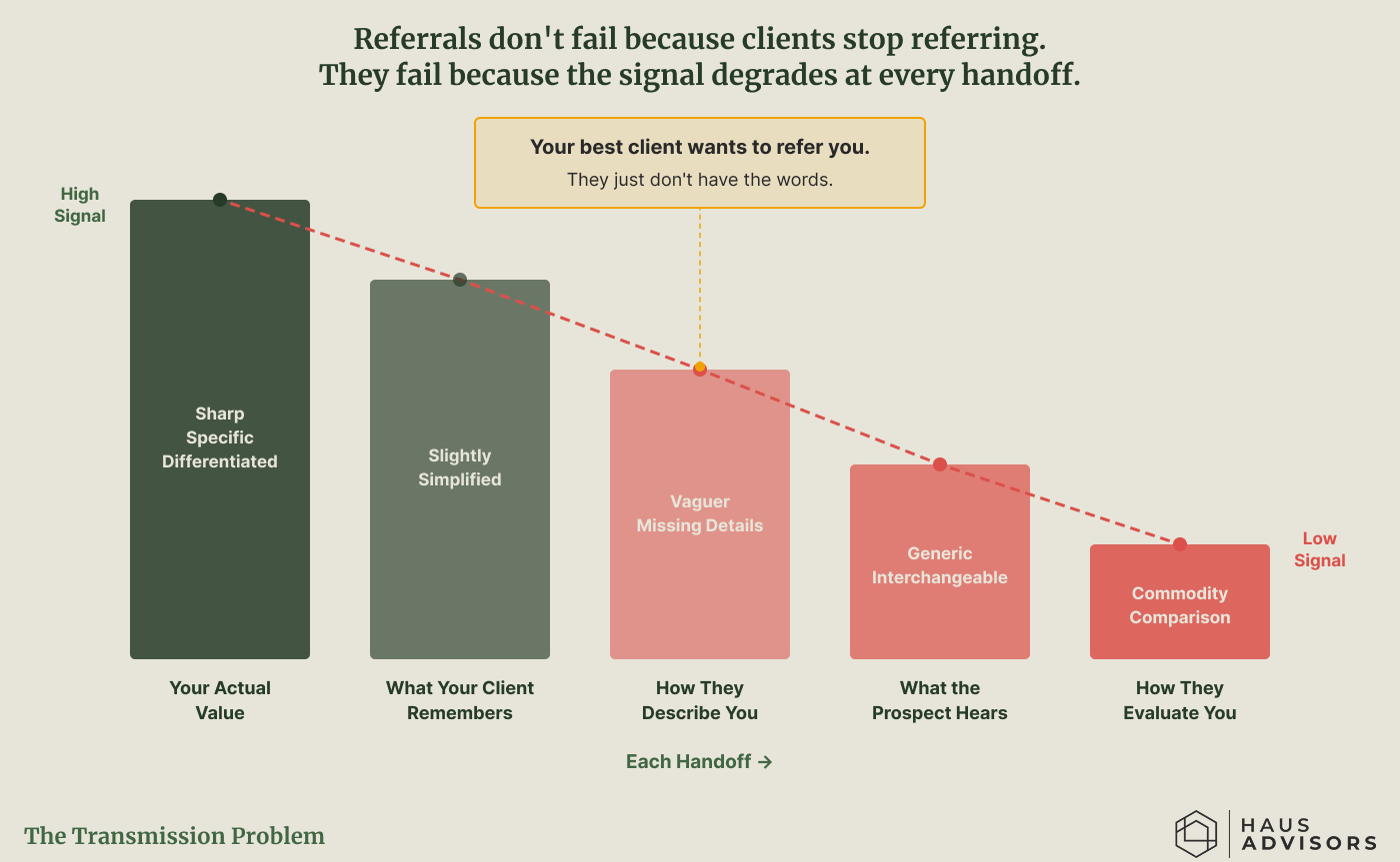 The Transmission Problem: Your client has a specific experience of your value. But at each handoff, the signal loses fidelity. By the time a prospect hears about you, they're comparing you to everyone else.