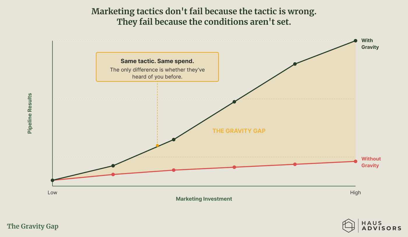 The same marketing investment produces completely different results depending on whether the market already knows who you are. Without gravity, every tactic starts from zero. With it, the same spend compounds.