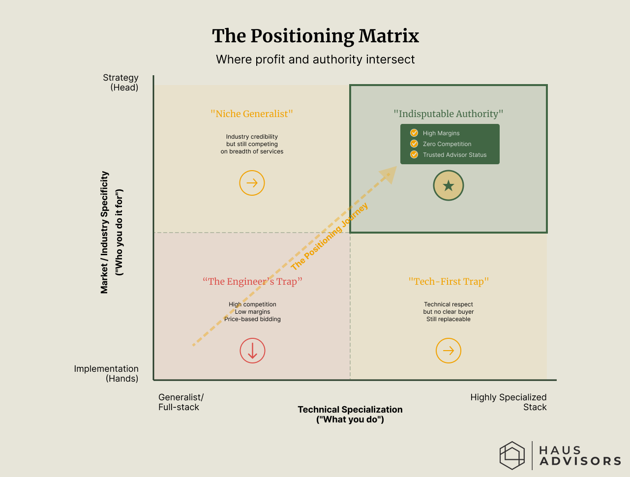 At Haus Advisors, we help technical agency founders escape the Engineer's Trap by translating their technical expertise into positioning that the market can evaluate before the first call. If you're winning on delivery but losing on pipeline, the gap isn't your engineering quality. It's your ability to make that quality visible to the right buyers. Our Why Us Sprint builds that bridge in three weeks. Book a strategy call here →