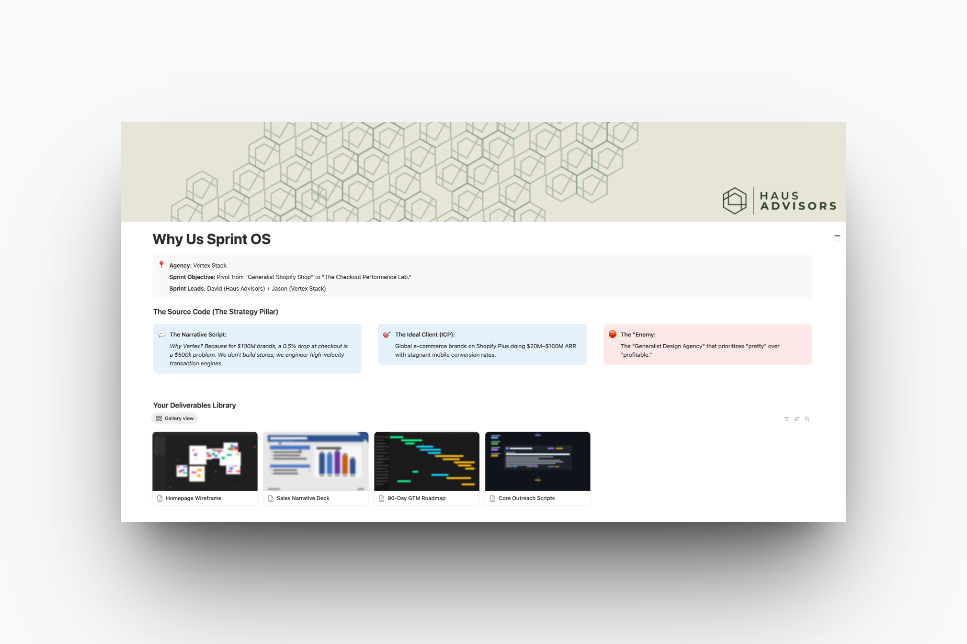 I finalize your homepage wireframe, the sales deck structure, and your GTM roadmap. We have a final 60-minute session to walk through every asset. I show you exactly how to hand these to your team (or freelancers) so you can stop being the bottleneck and start being the strategist.